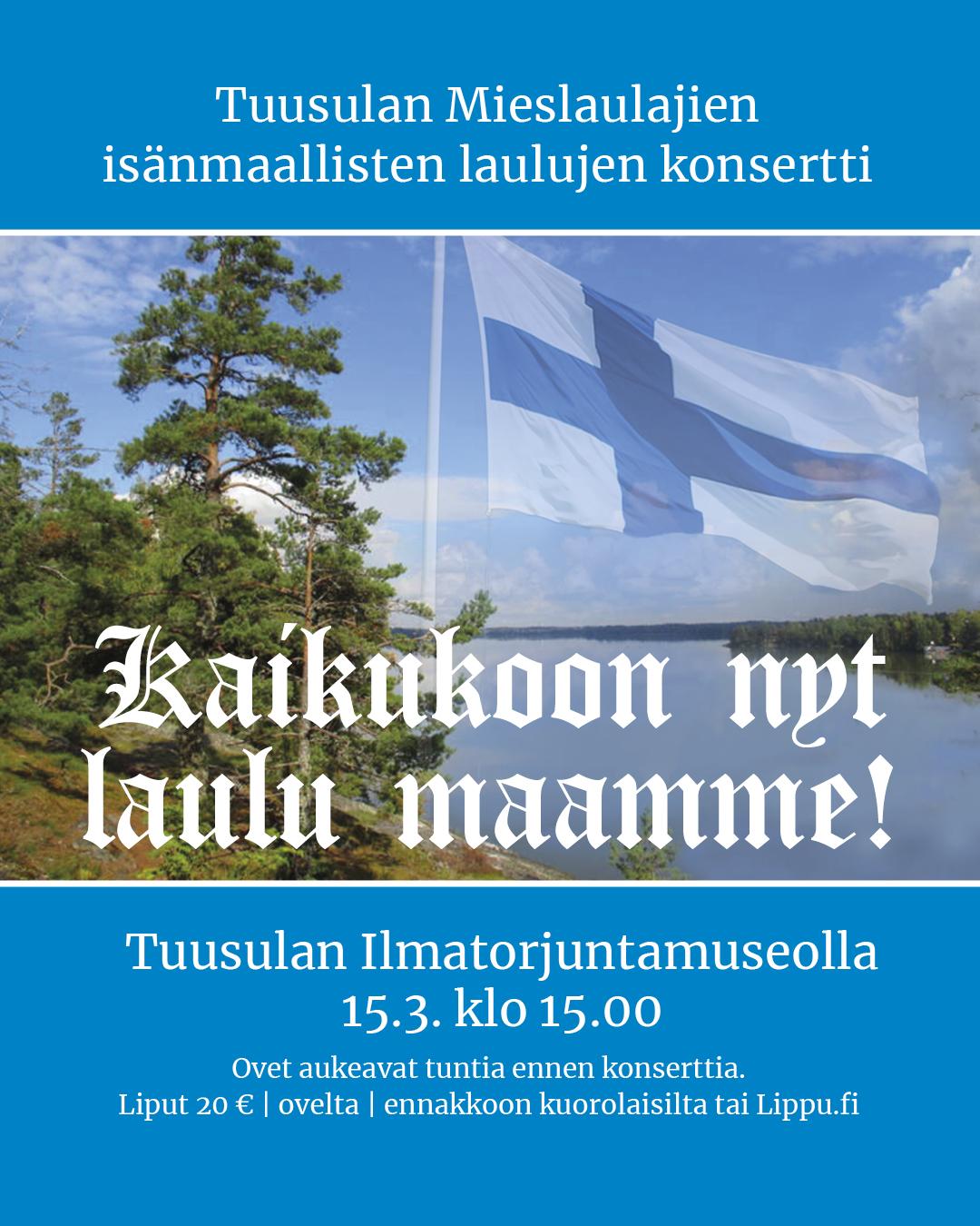 Tuusulan Mieslaulajien isänmaallisten laulujen konsertti "Kaikukoon nyt laulu maamme" pidetään Ilmatorjuntamuseon Tuusula-hallissa, Klaavolantie 2, Tuusula 15.3.2026. Konsertti alkaa klo 15:00 ja…